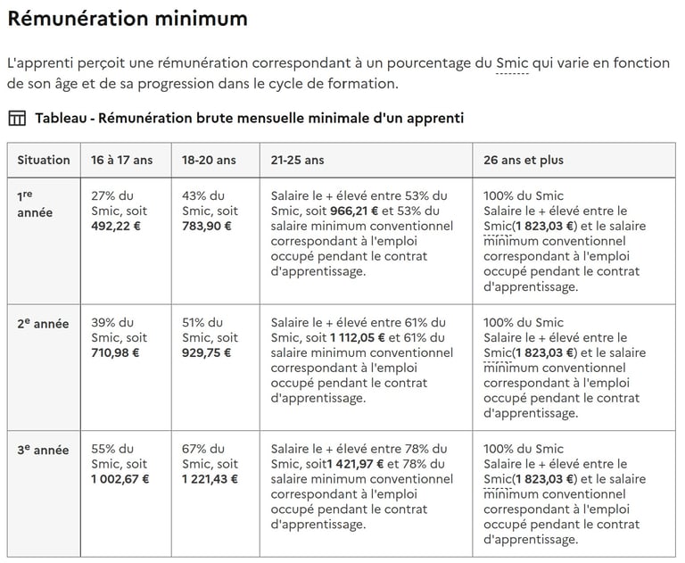 Salaire brut mensuel en contrat d'apprentissage. Source service-public.gouv.fr du 1er janvier 2026