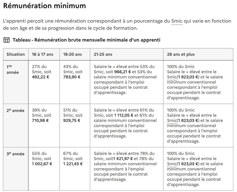 Salaire brut mensuel en contrat d'apprentissage. Source service-public.gouv.fr du 1er janvier 2026