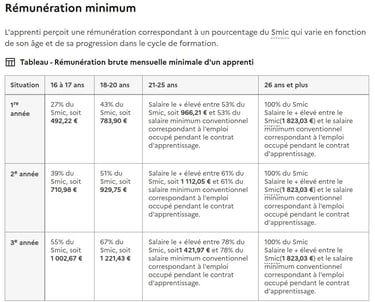 L'apprenti perçoit une rémunération correspondant à un pourcentage du Smic qui varie en fonction de son âge et de sa progression dans le cycle de formation.