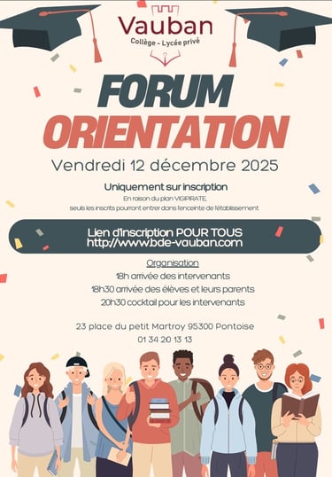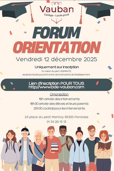 Un grand merci au lycée privé VAUVAN de Pontoise de nous avoir invités à l’occasion de son « Forum orientation » le 12 décembre dernier. De nombreux lycéens de première et terminale ont parcouru les stands des différentes écoles et se sont particulièrement intéressés au stand de l’ESCEF pour leurs orientations dans les différents BTS proposés. Nous leurs souhaitons de joyeuses fêtes de fin d’année. A l’année prochaine !